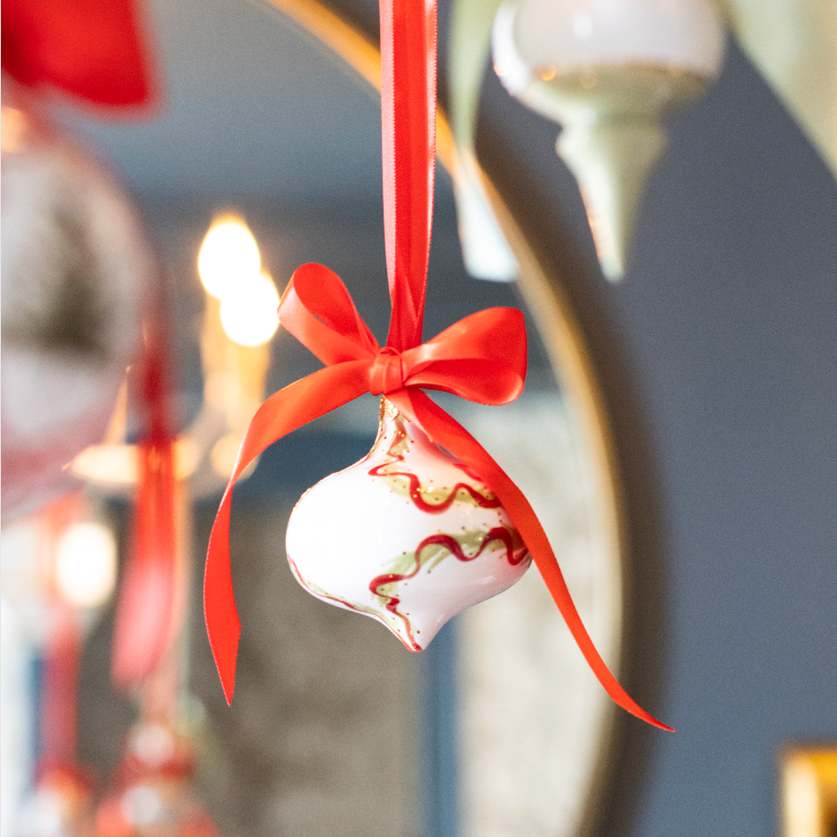 An evolution of your favorite Finial Ornaments from last season, the new Christmas Garland Finial Ornament was designed with personalization in mind! Featuring swaths of hand-painted, ribbon-wrapped garland and 22k gold luster accents, this new ornament elegantly allows for our hand lettered personalization to be beautifully integrated with the design.