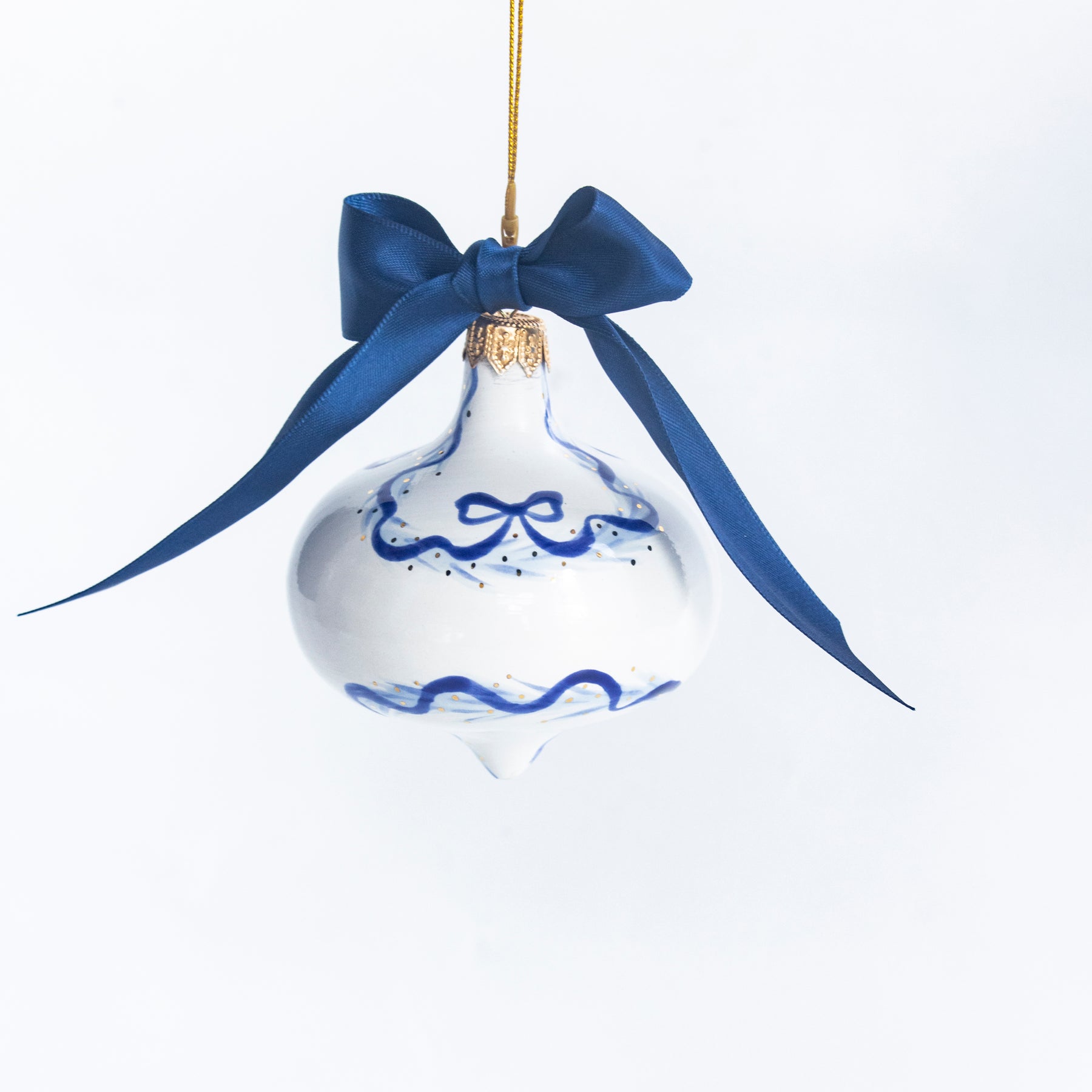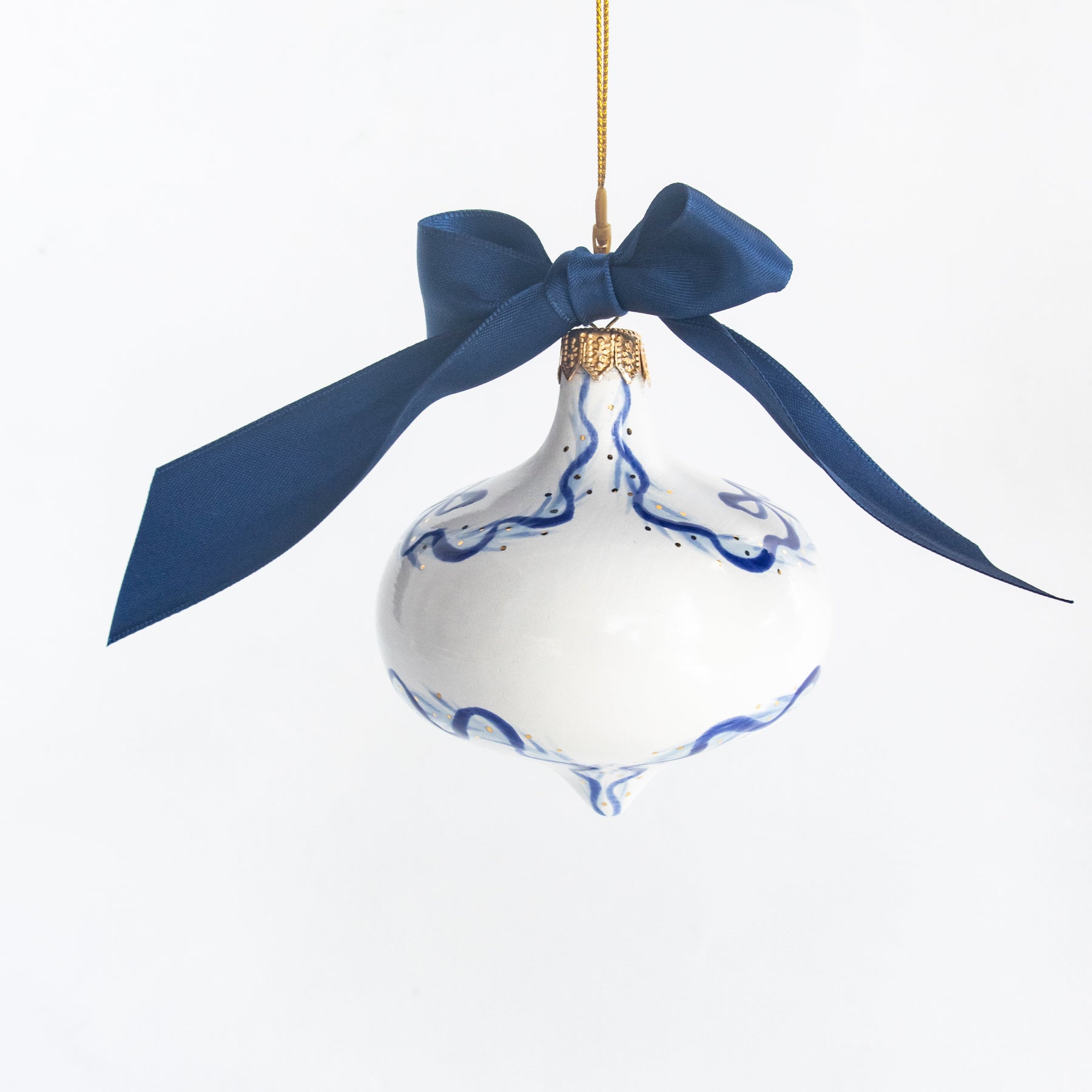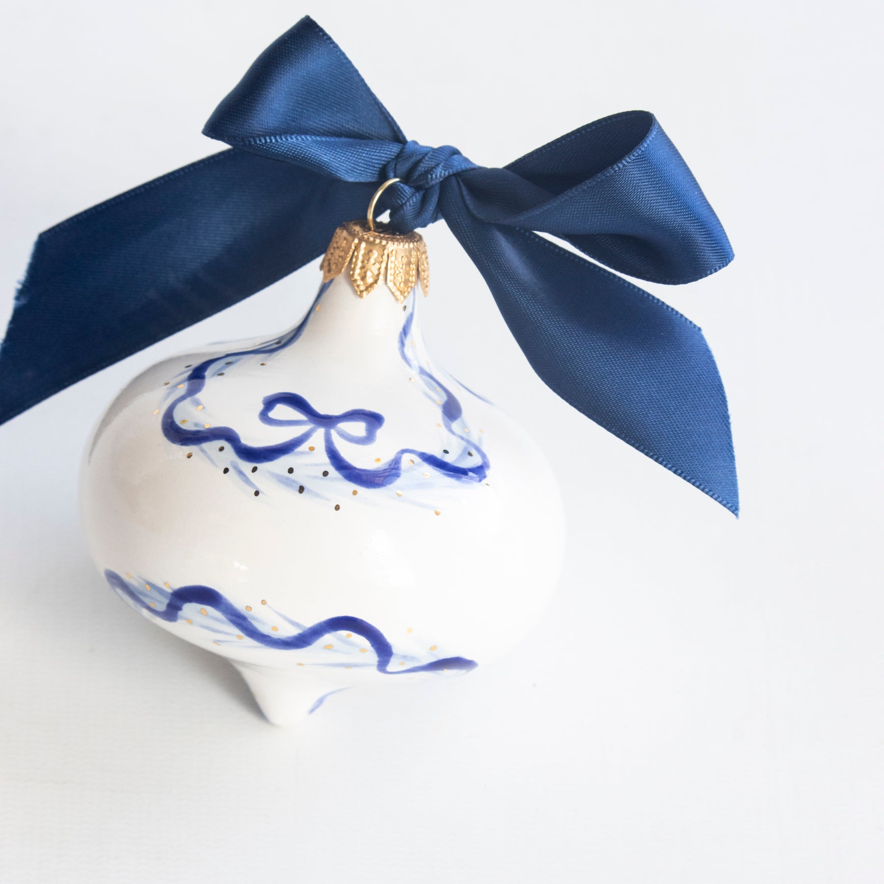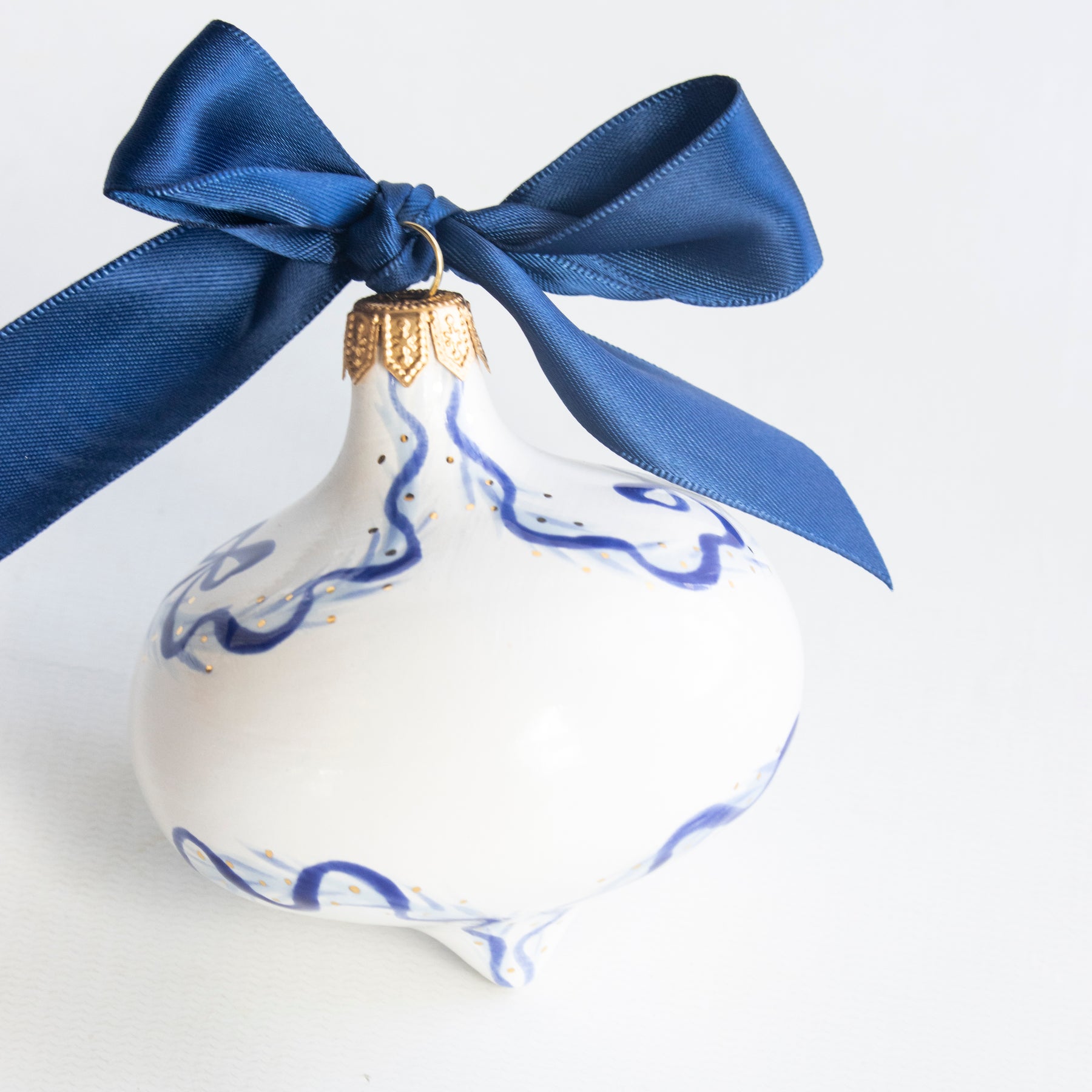 An evolution of your favorite Finial Ornaments from last season, the new Christmas Garland Finial Ornament was designed with personalization in mind! Featuring swaths of hand-painted, ribbon-wrapped garland and 22k gold luster accents, this new ornament elegantly allows for our hand lettered personalization to be beautifully integrated with the design.