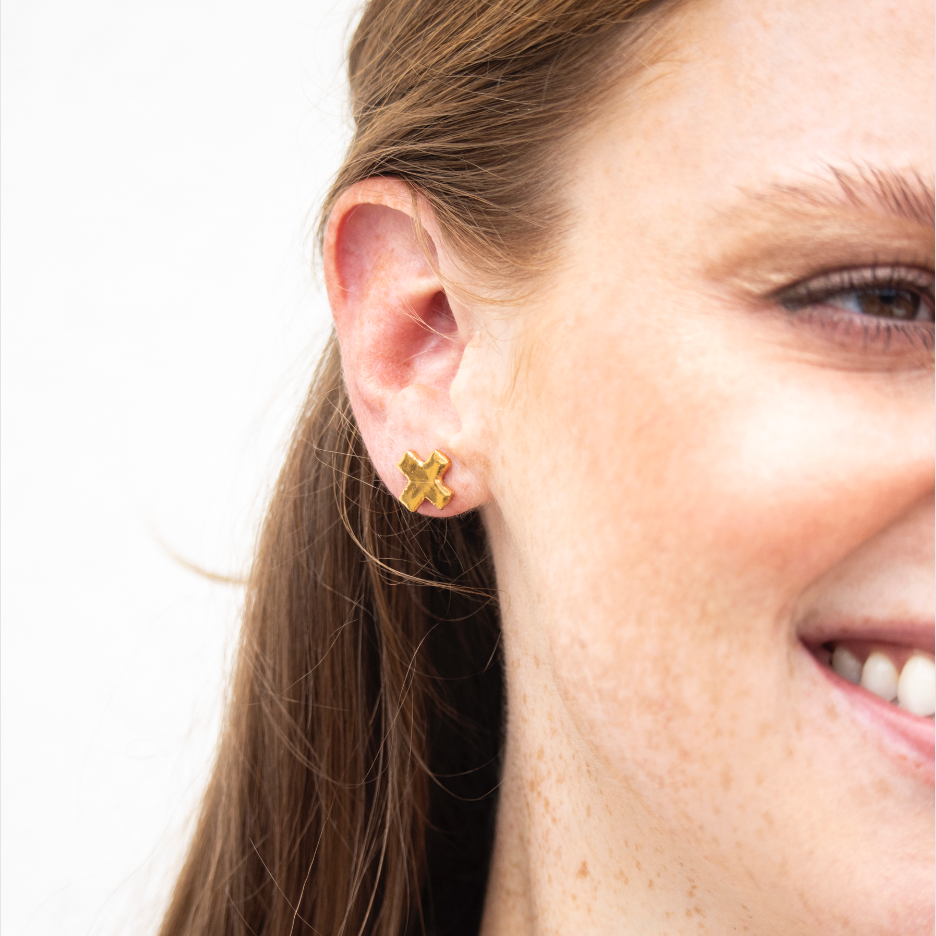 Each earring, made of high fired stoneware clay, is handcrafted from start to finish in my studio. They are then cleaned, bisque fired, glazed, glaze-fired, and then hand-painted with 22K gold luster and fired for a third and final firing to melt and fuse the gold to the vitrified ceramic surface.