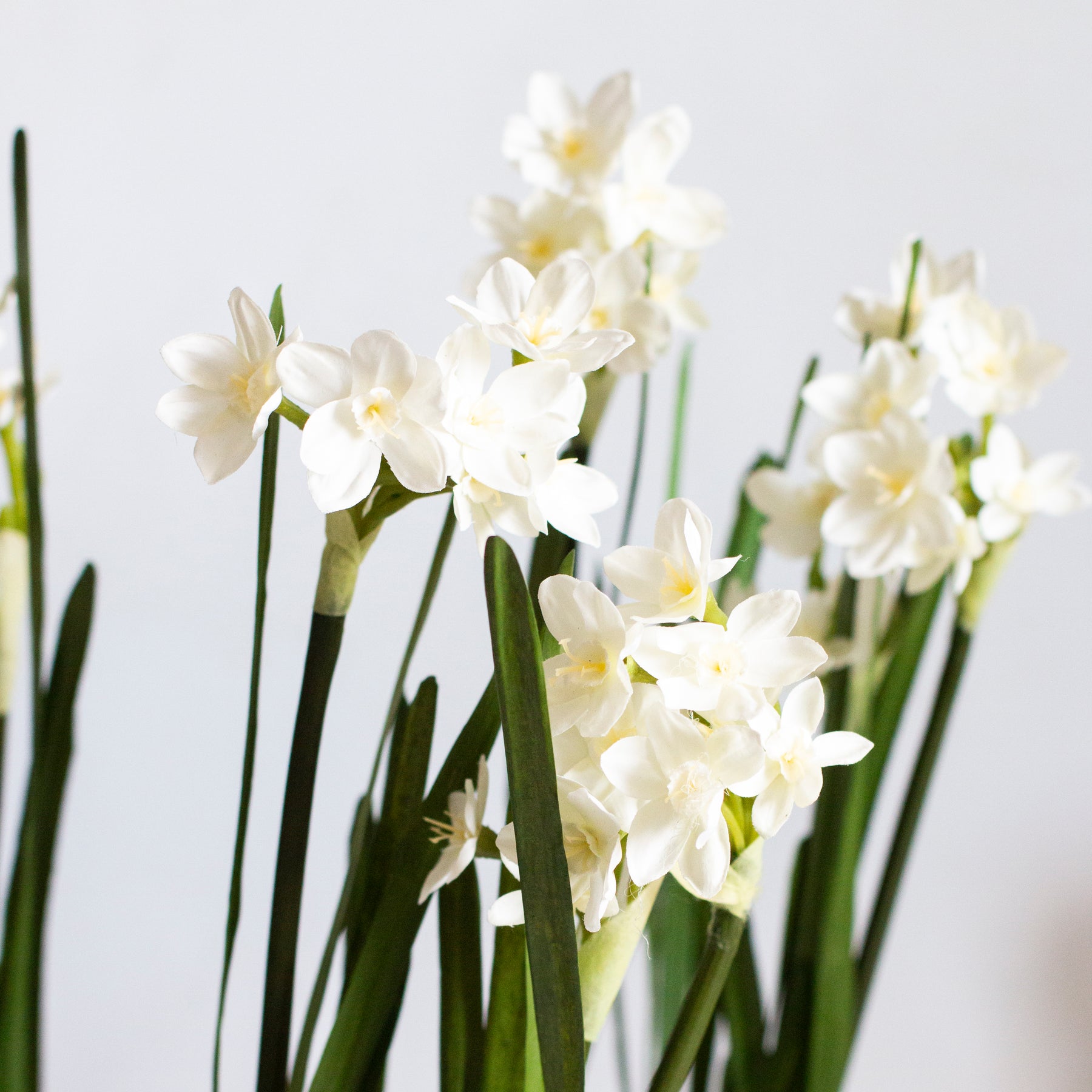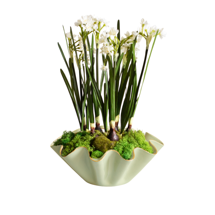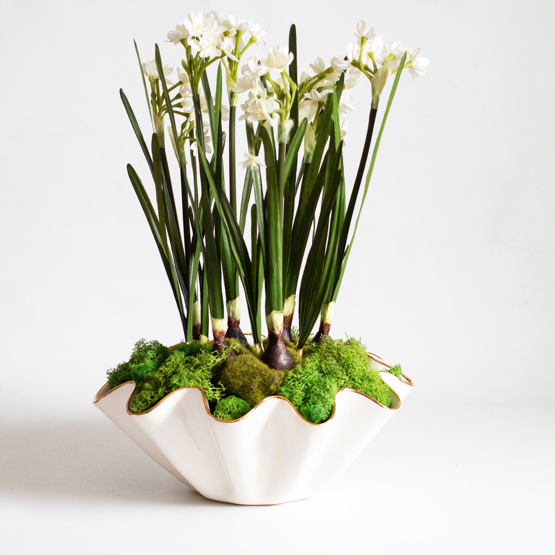 A Christmas staple, the paperwhite symbolizes hope and faithfulness. Enjoy our delicately beautiful, faux paperwhites year after year. Each kit comes with faux paperwhites and moss that fit in our wavy bowl. When planting your paperwhites use crumpled paper to secure your bulbs then cover with moss then tie a bow around the stems for a festive look.