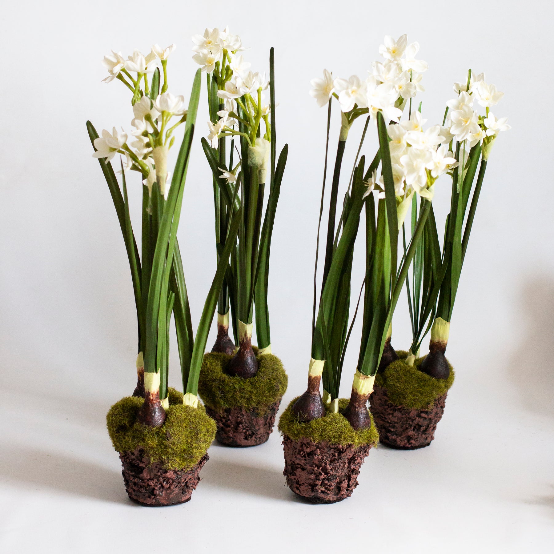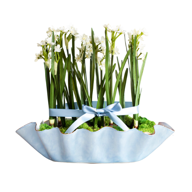 A Christmas staple, the paperwhite symbolizes hope and faithfulness. Enjoy our delicately beautiful, faux paperwhites year after year. Each kit comes with faux paperwhites and moss that fit in our wavy bowl. When planting your paperwhites use crumpled paper to secure your bulbs then cover with moss then tie a bow around the stems for a festive look.