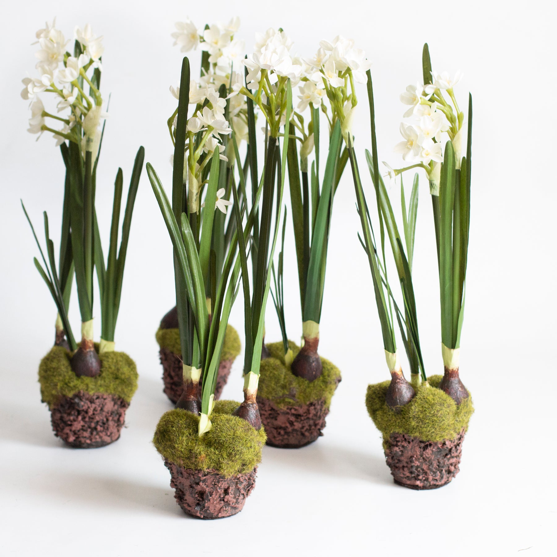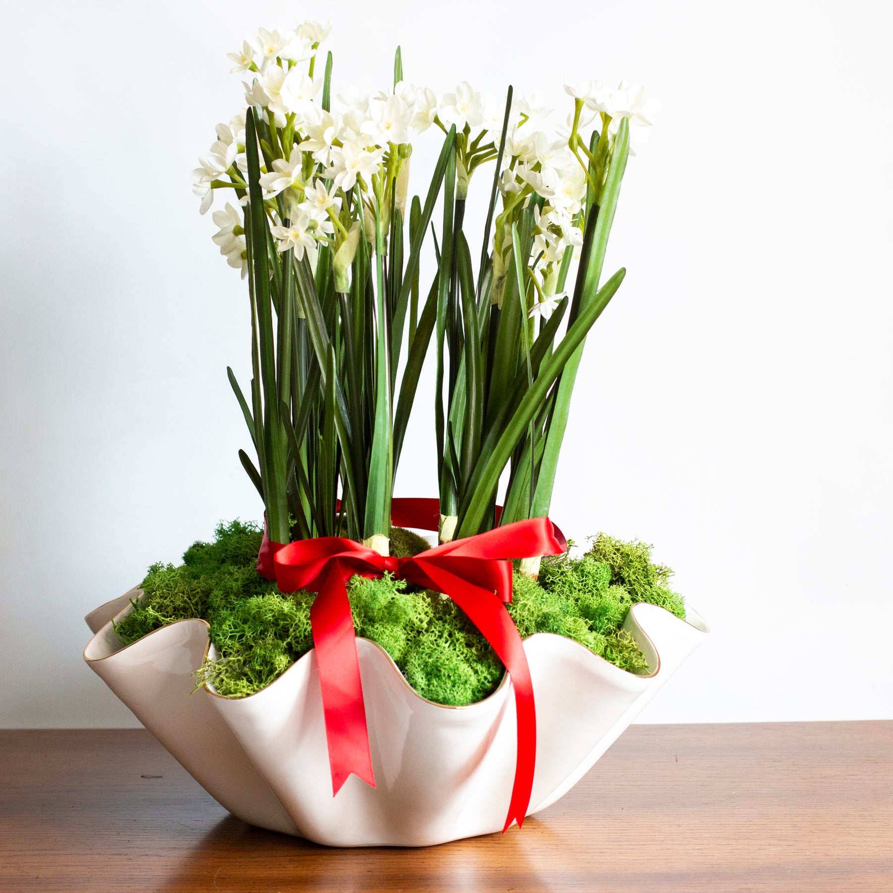 A Christmas staple, the paperwhite symbolizes hope and faithfulness. Enjoy our delicately beautiful, faux paperwhites year after year. Each kit comes with faux paperwhites and moss that fit in our wavy bowl. When planting your paperwhites use crumpled paper to secure your bulbs then cover with moss then tie a bow around the stems for a festive look.