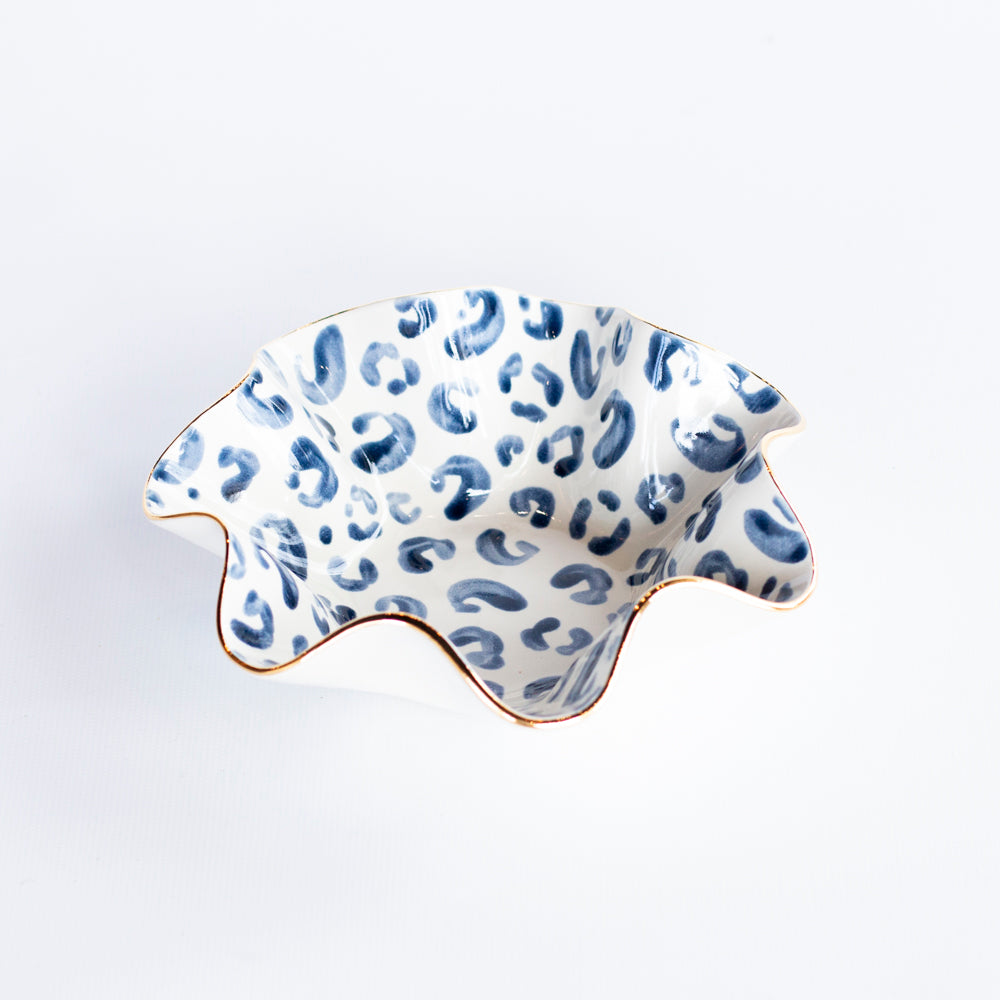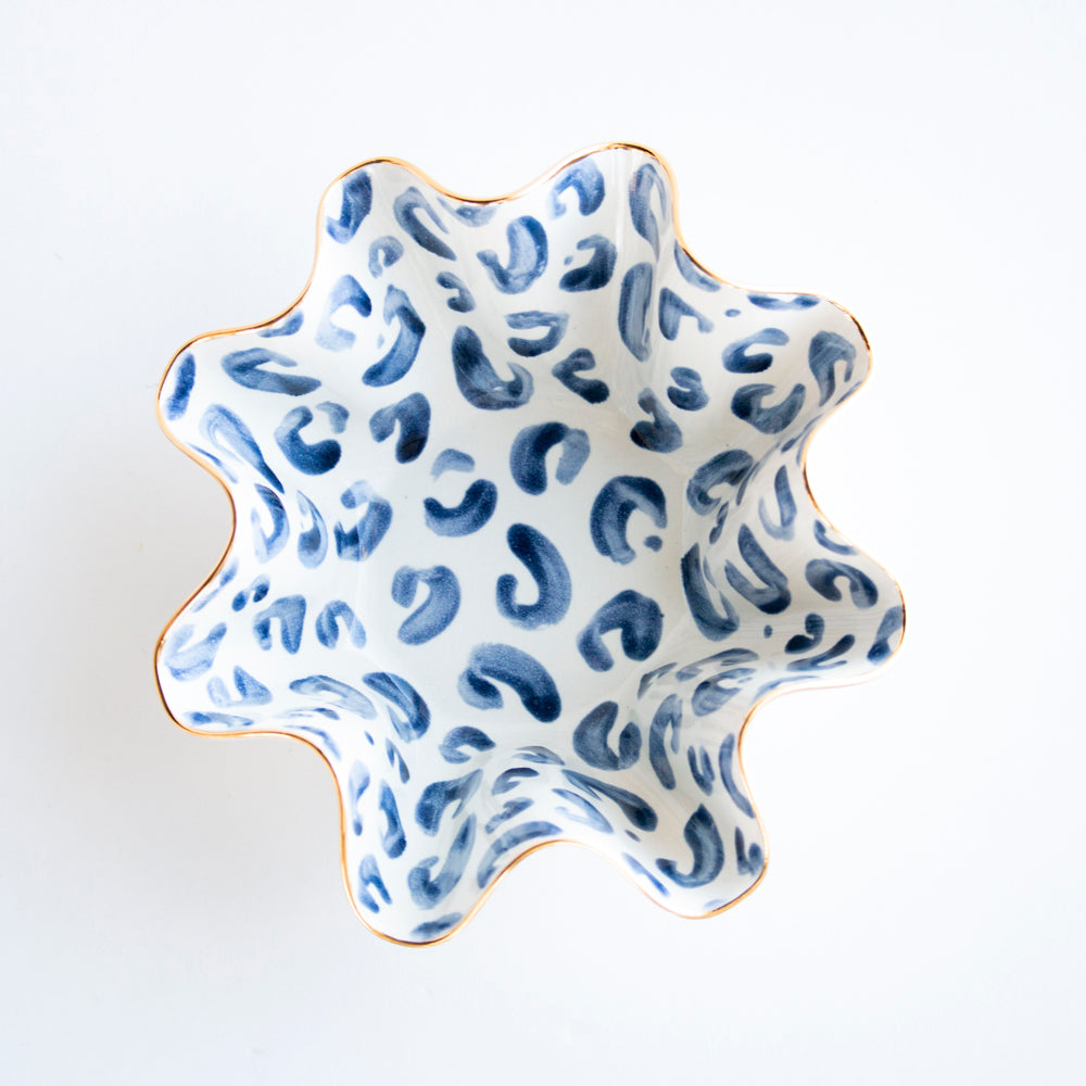Handmade ceramic abstract bowl with high fire stoneware clay and glazes. Hand painted Leopard pattern. Adorned with low fire 22K gold luster overglaze.