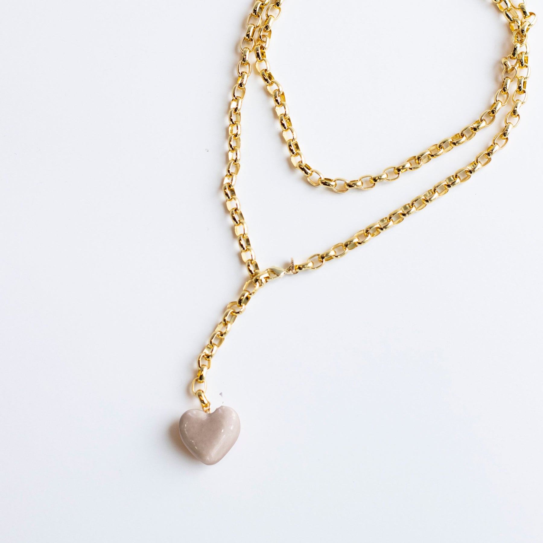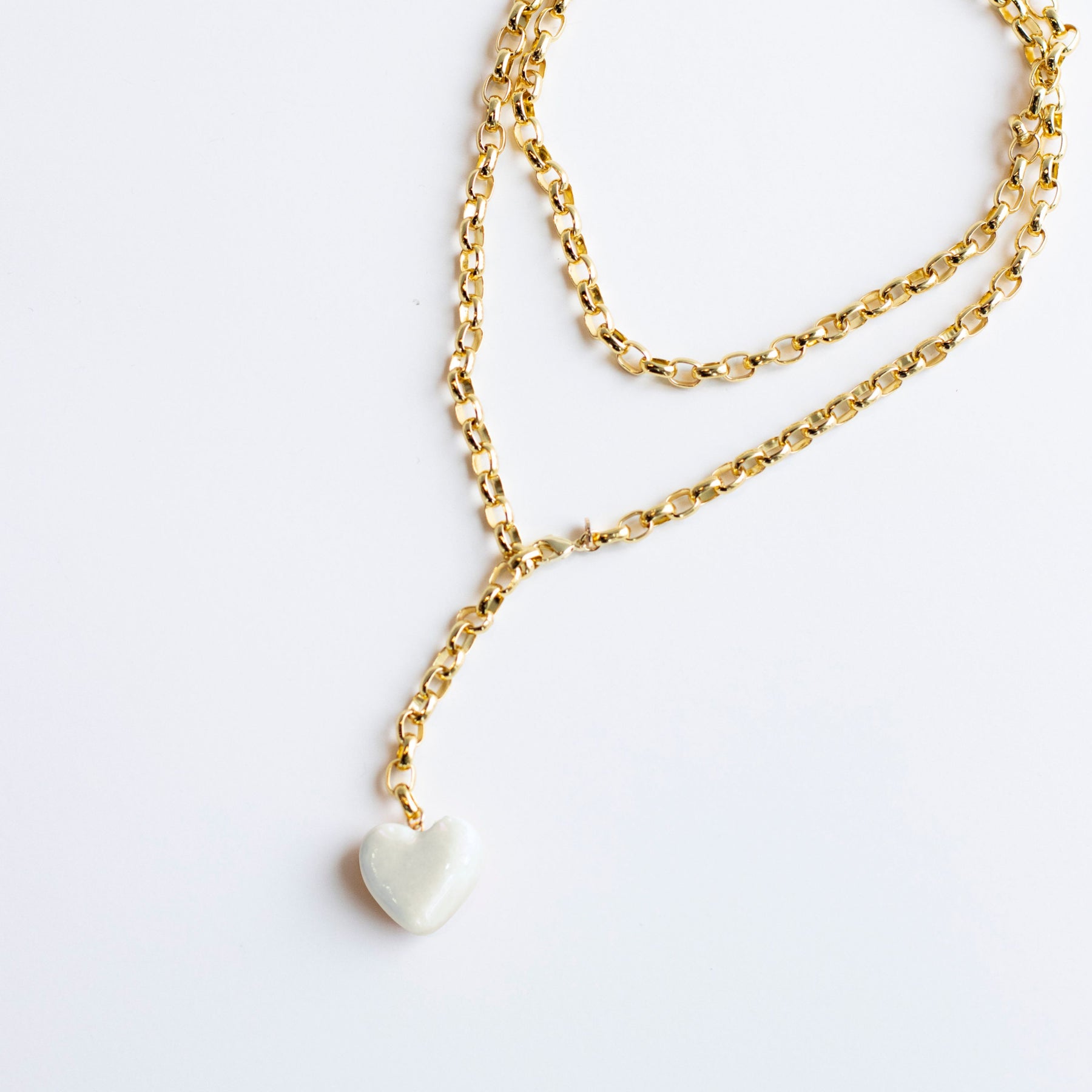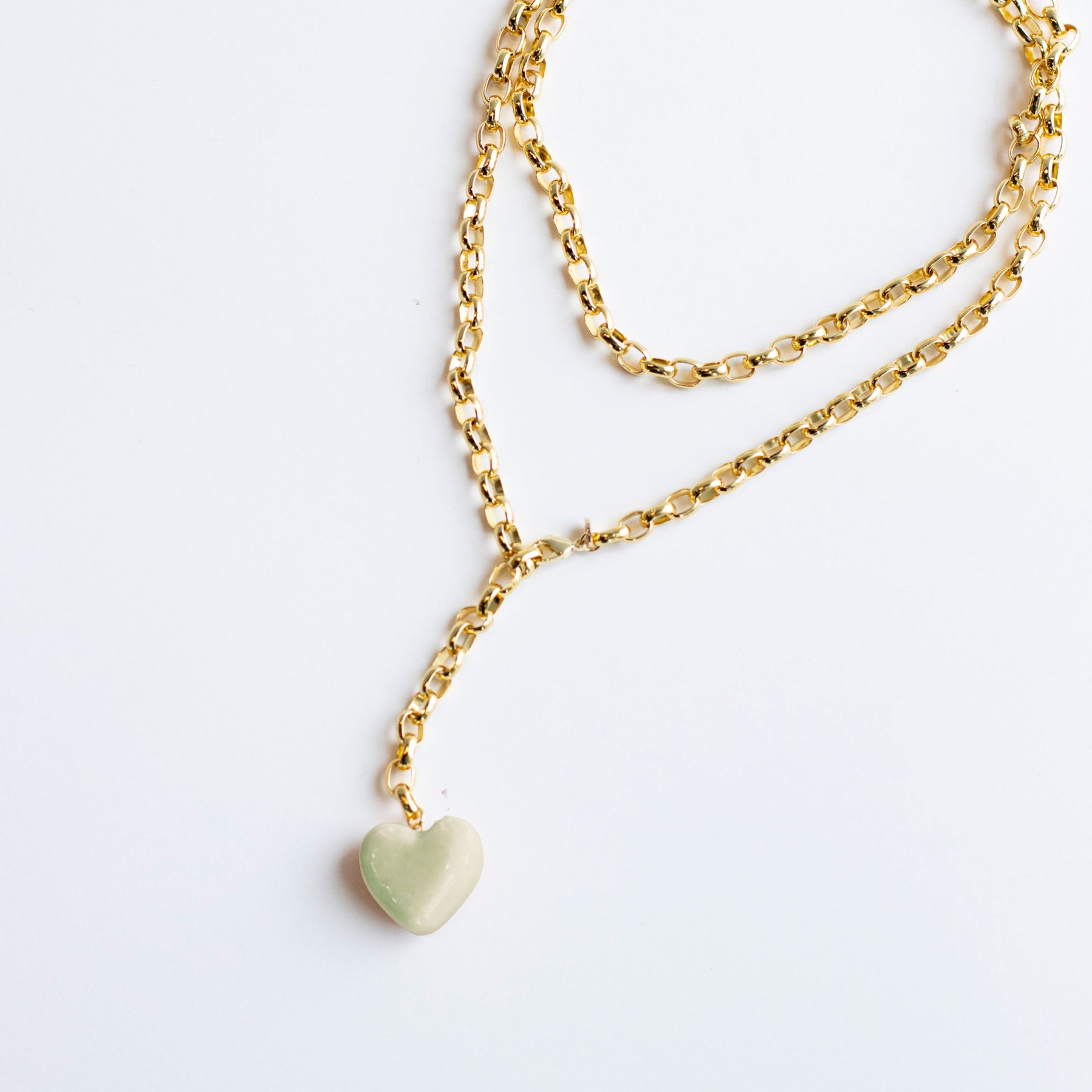 Each Puffy Two-Tone Heart is handcrafted from clay, glazed in your choice of solid color (White, Sage, Latte, French Blue, or Peony.) It hangs from a 32” long, 8mm thick, 18k gold plated rolo chain with a lobster clasp that can be fastened at any link for versatile styling.