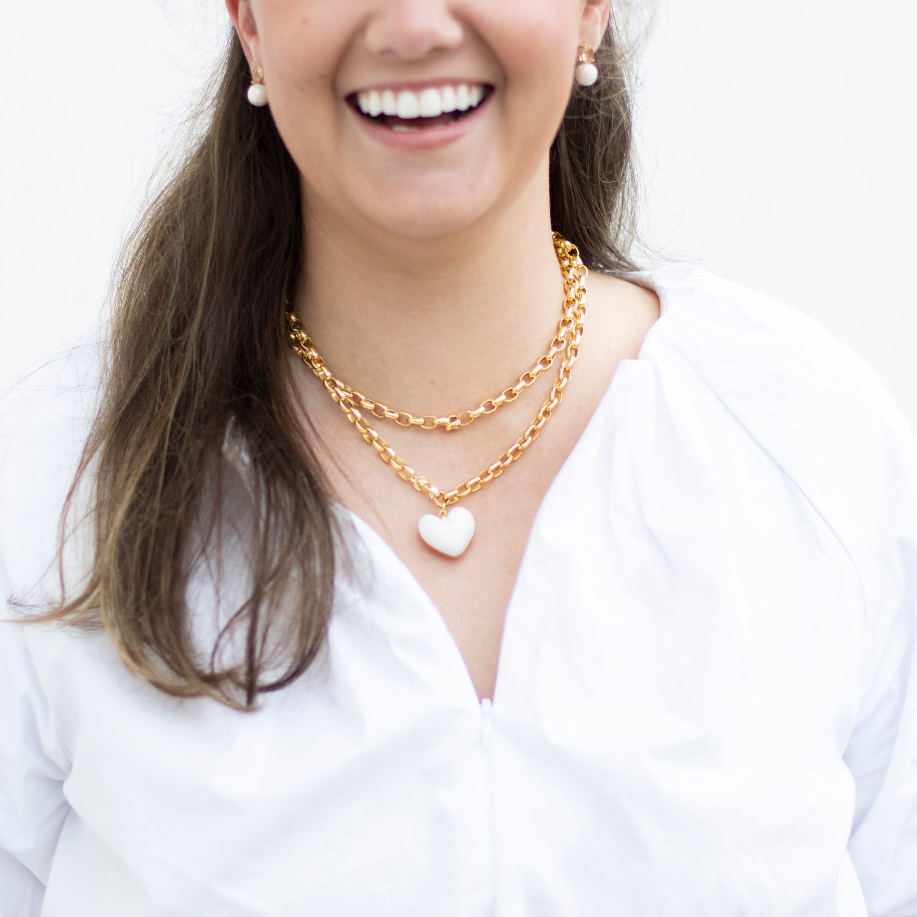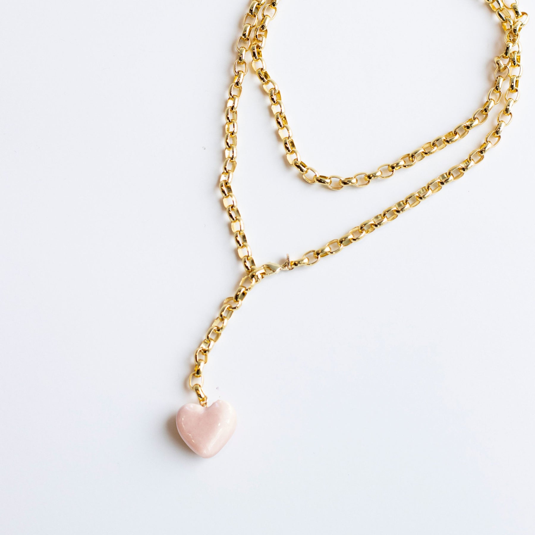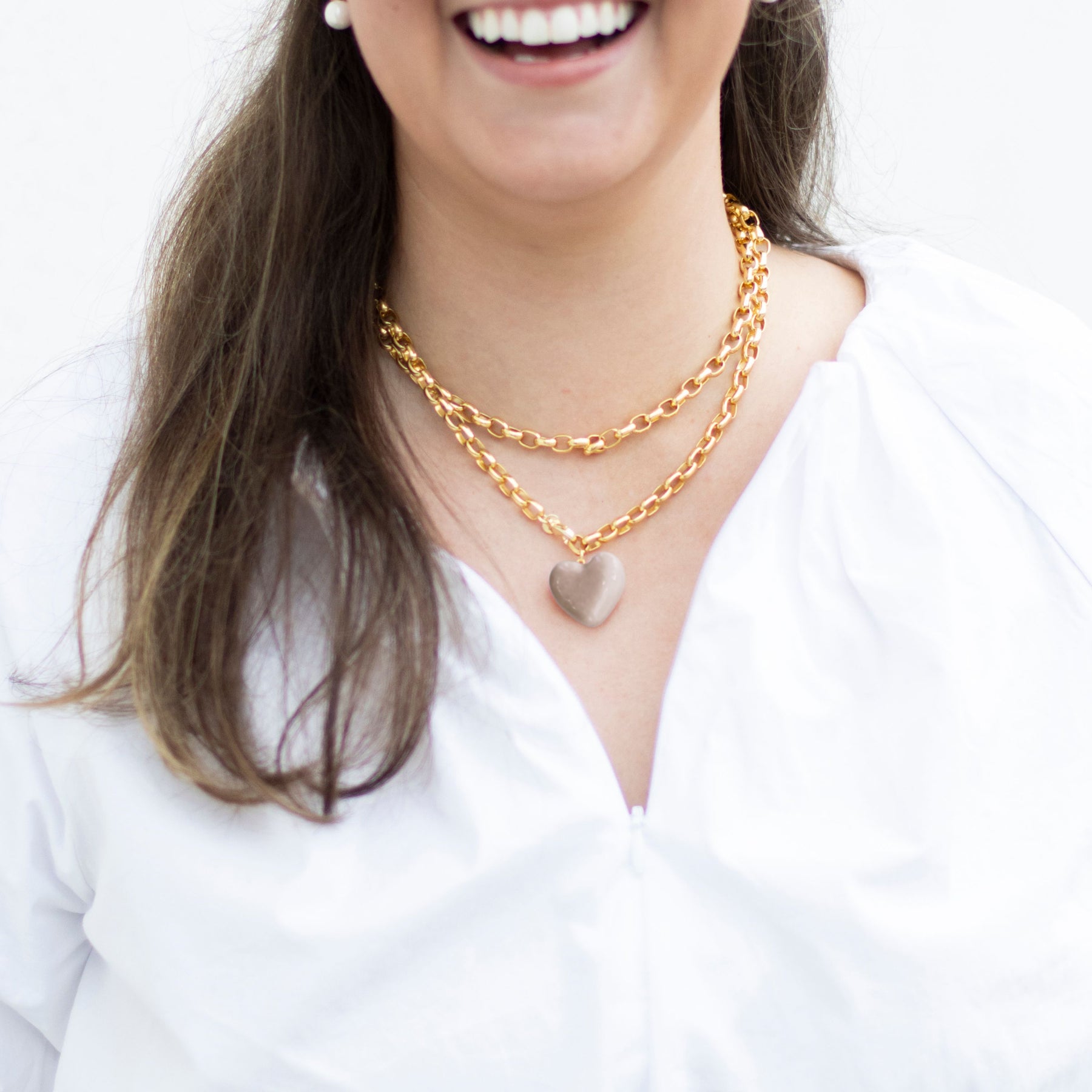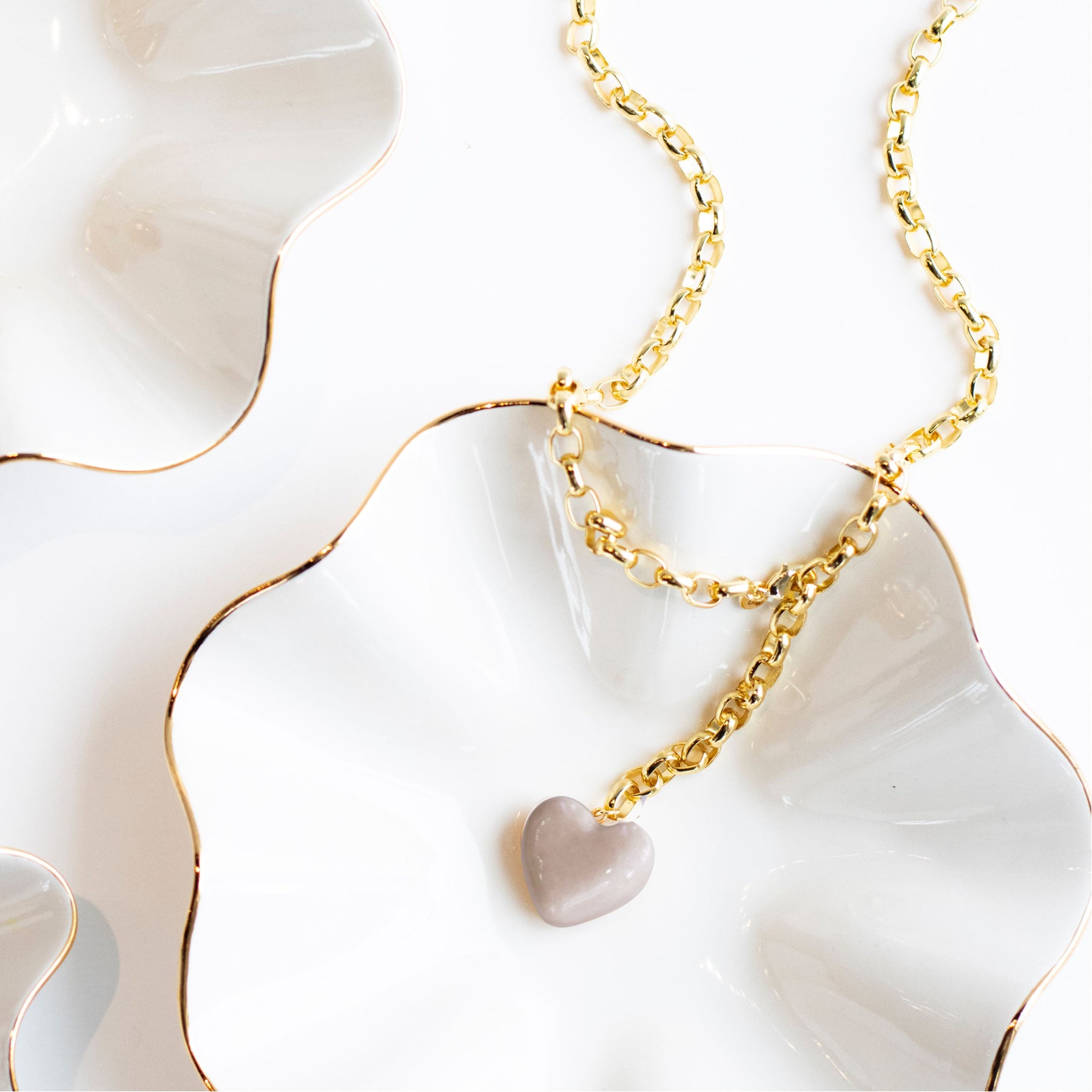 Each Puffy Two-Tone Heart is handcrafted from clay, glazed in your choice of solid color (White, Sage, Latte, French Blue, or Peony.) It hangs from a 32” long, 8mm thick, 18k gold plated rolo chain with a lobster clasp that can be fastened at any link for versatile styling.