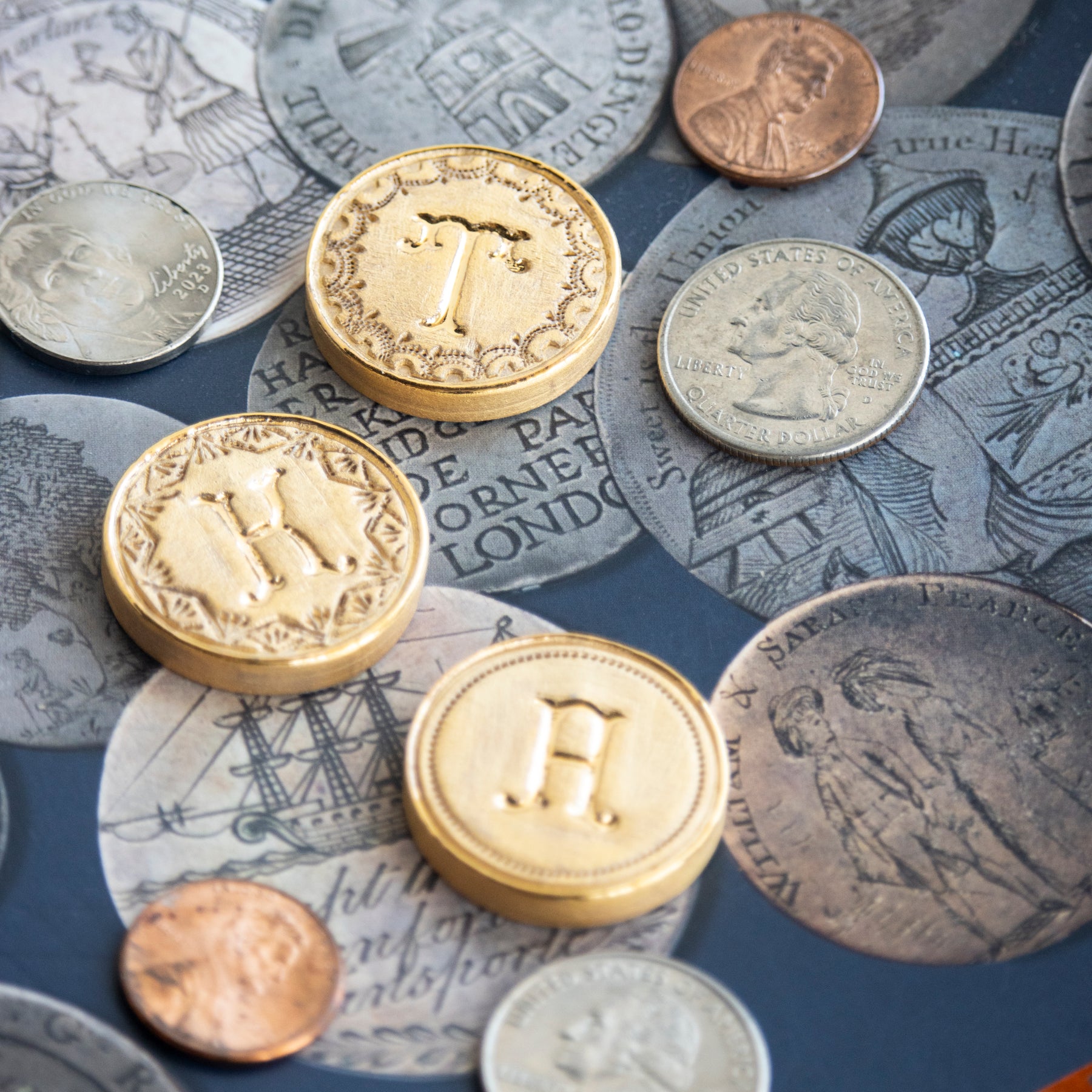 Victorian Love Token Jewelry, popular in the 18th century and later outlawed, was created by smoothing one side of a coin such as a copper penny or a silver dollar and adding custom engraving with a stylistic monogram or initial. The story of the Love Token tradition that really appealed to me was that they weren’t just gifted to convey affection, they were small objects of art meant to communicate a feeling or express a sense of identity.