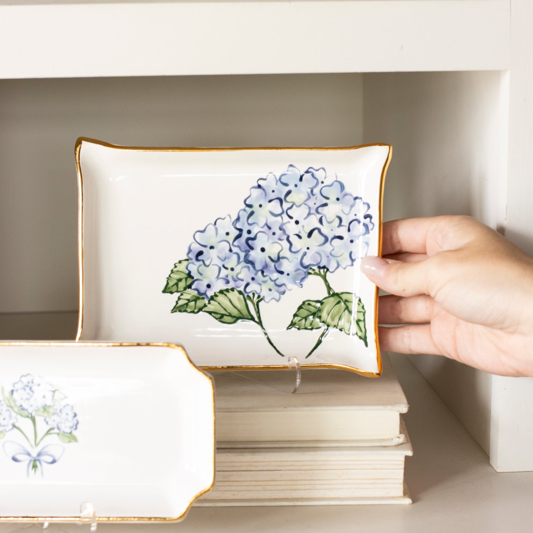 Handmade oval ceramic pinch dish. Glazed with high fire stoneware clay and glazes and hand painted hydrangeas. Adorned with low fire 22K gold luster edges.