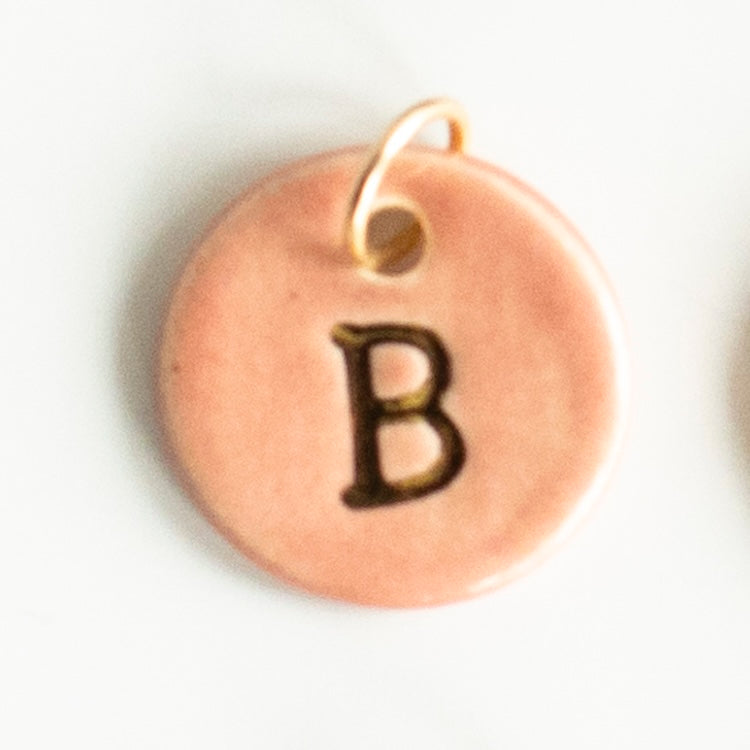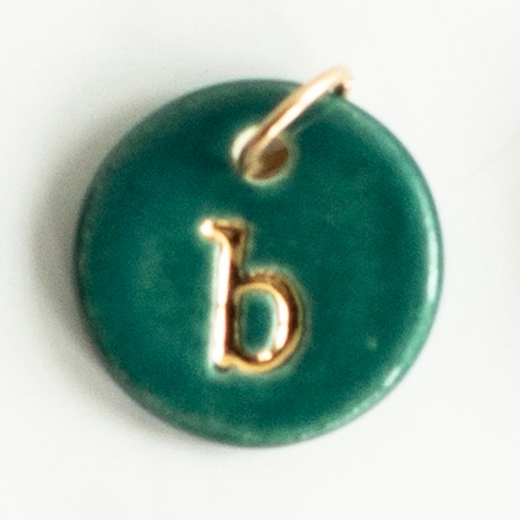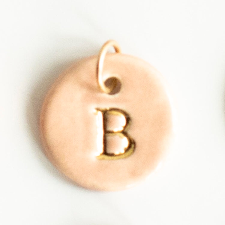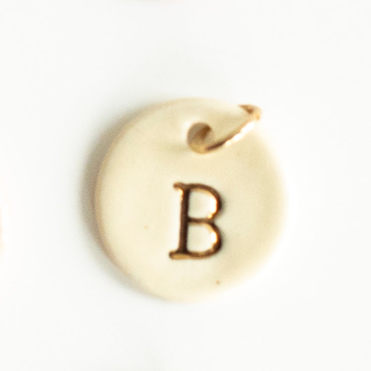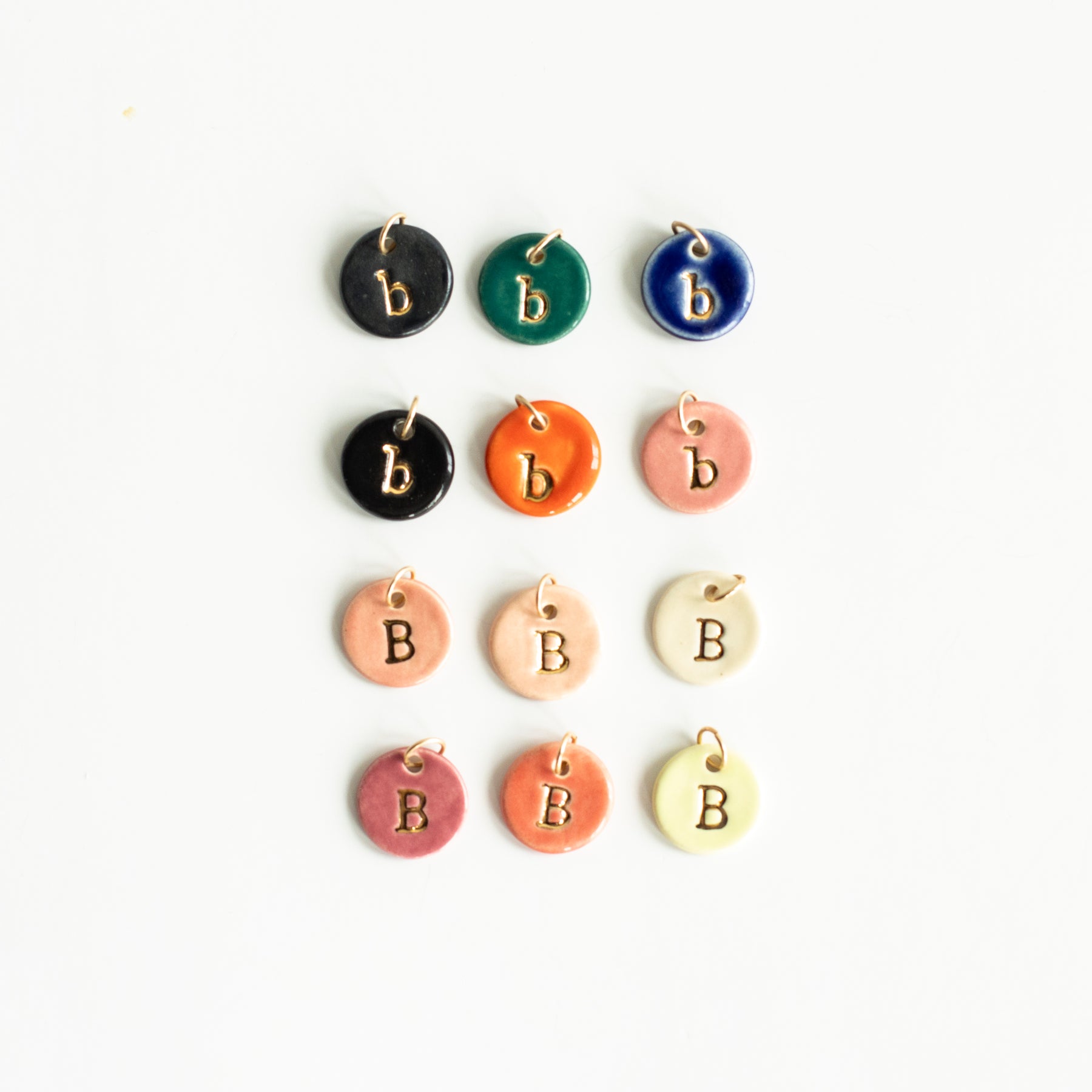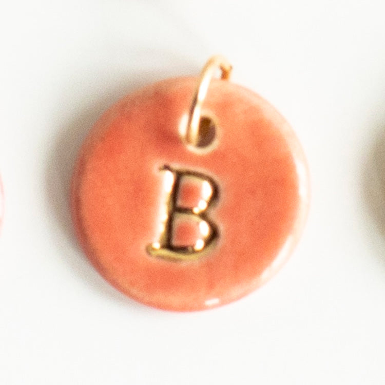 Charms are glazed on both sides for strength and durability; with a 'B' Initial impressed and gilded with 22k gold luster. Each charm measures about half an inch and jump rings are 14/20 gold filled. Each pendant will vary somewhat in color and finish as each are handmade.