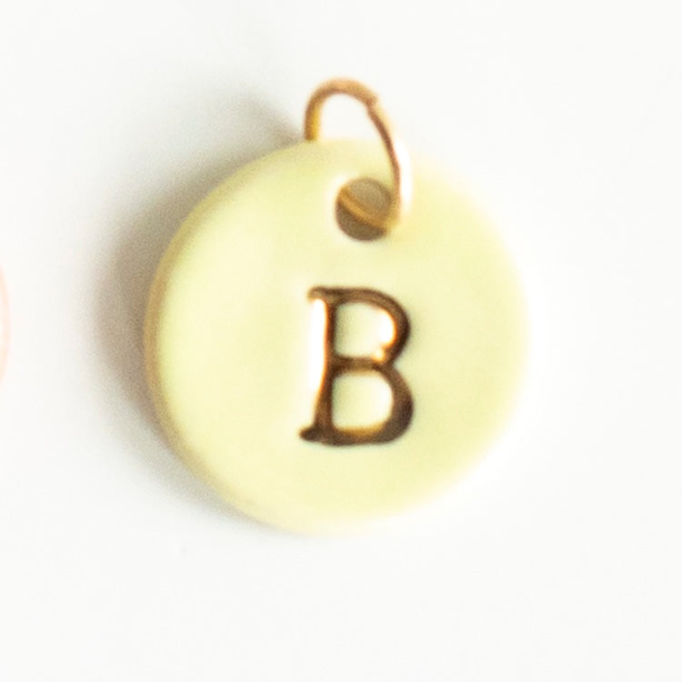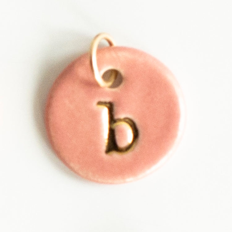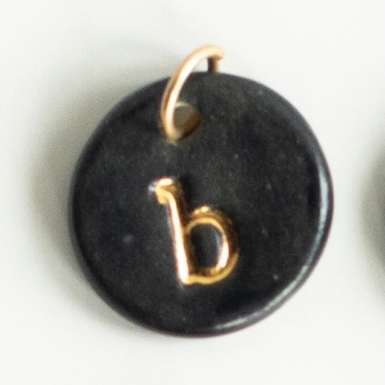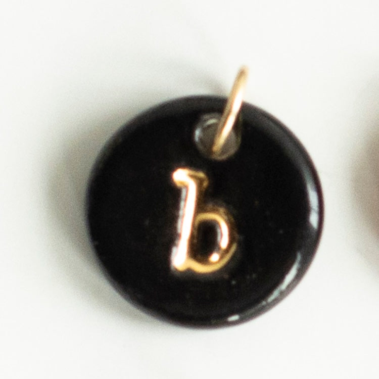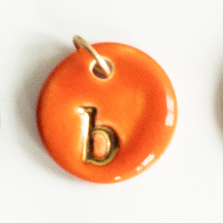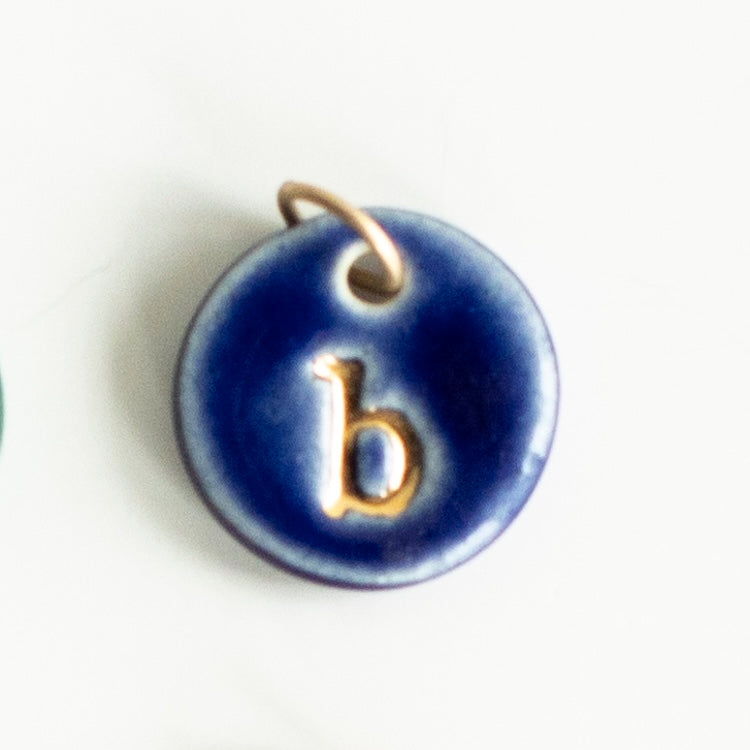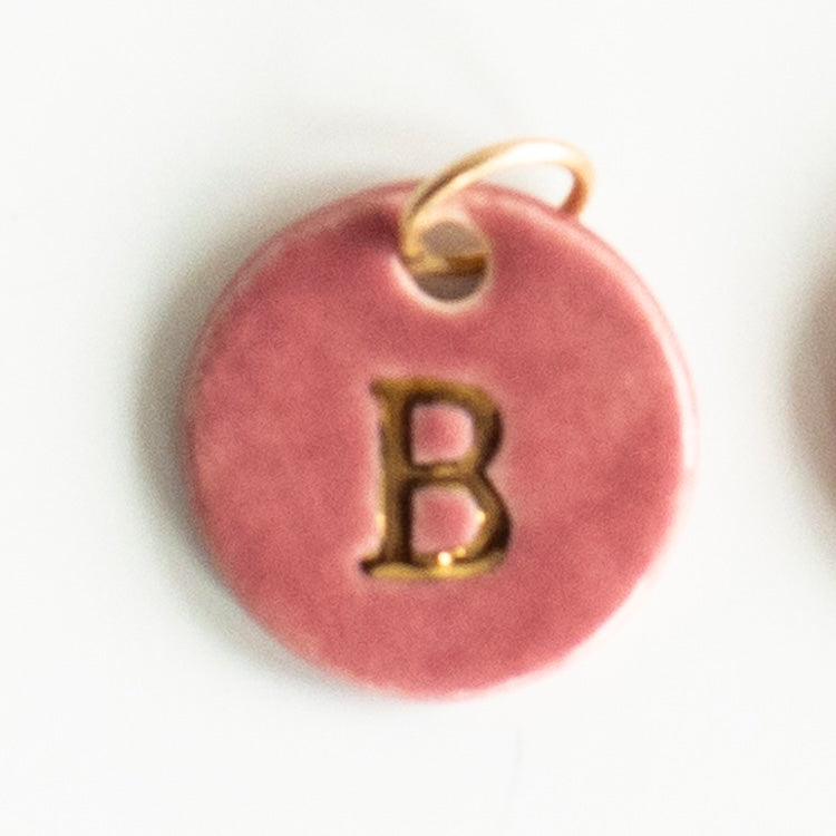 Charms are glazed on both sides for strength and durability; with a 'B' Initial impressed and gilded with 22k gold luster. Each charm measures about half an inch and jump rings are 14/20 gold filled. Each pendant will vary somewhat in color and finish as each are handmade.