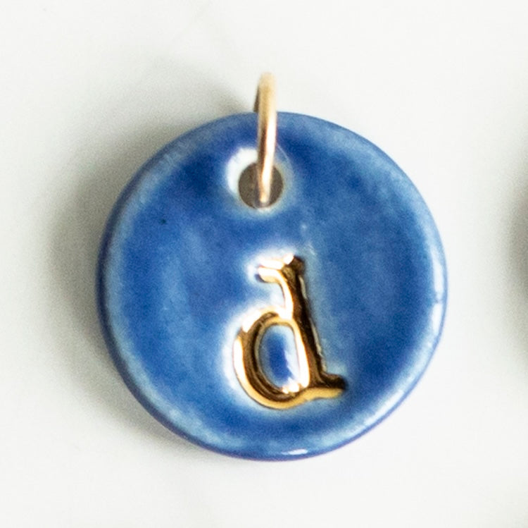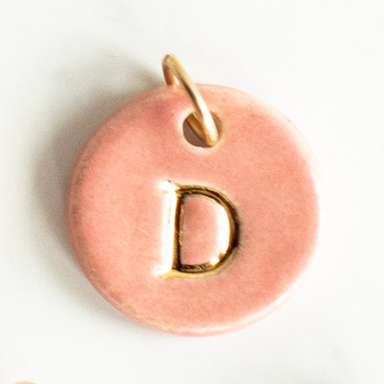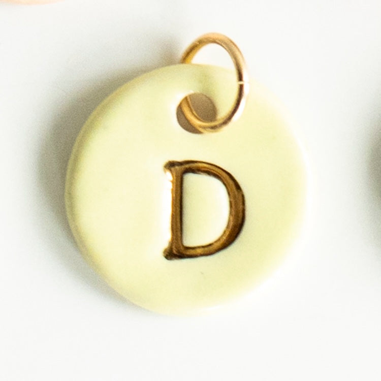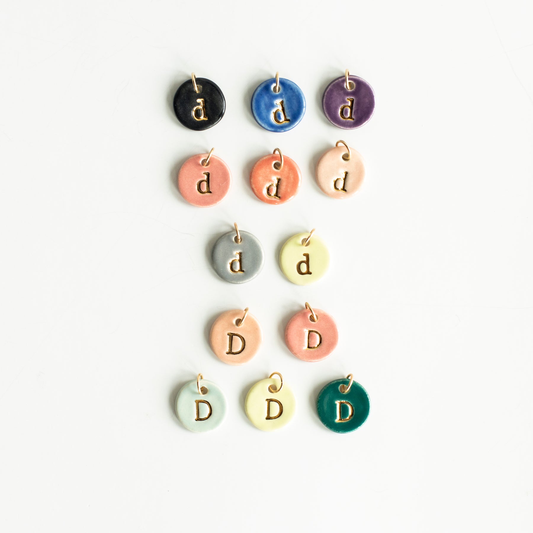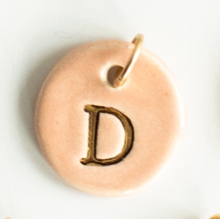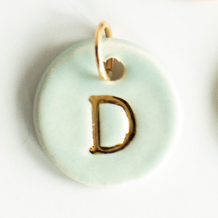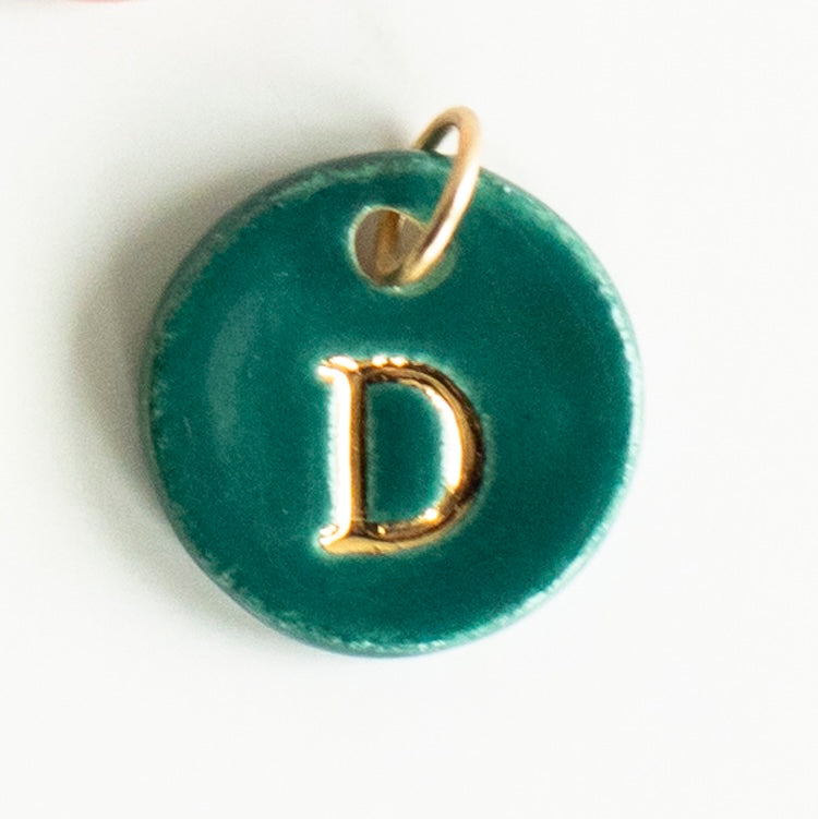Charms are glazed on both sides for strength and durability; with a 'D' Initial impressed and gilded with 22k gold luster. Each charm measures about half an inch and jump rings are 14/20 gold filled. Each pendant will vary somewhat in color and finish as each are handmade.
